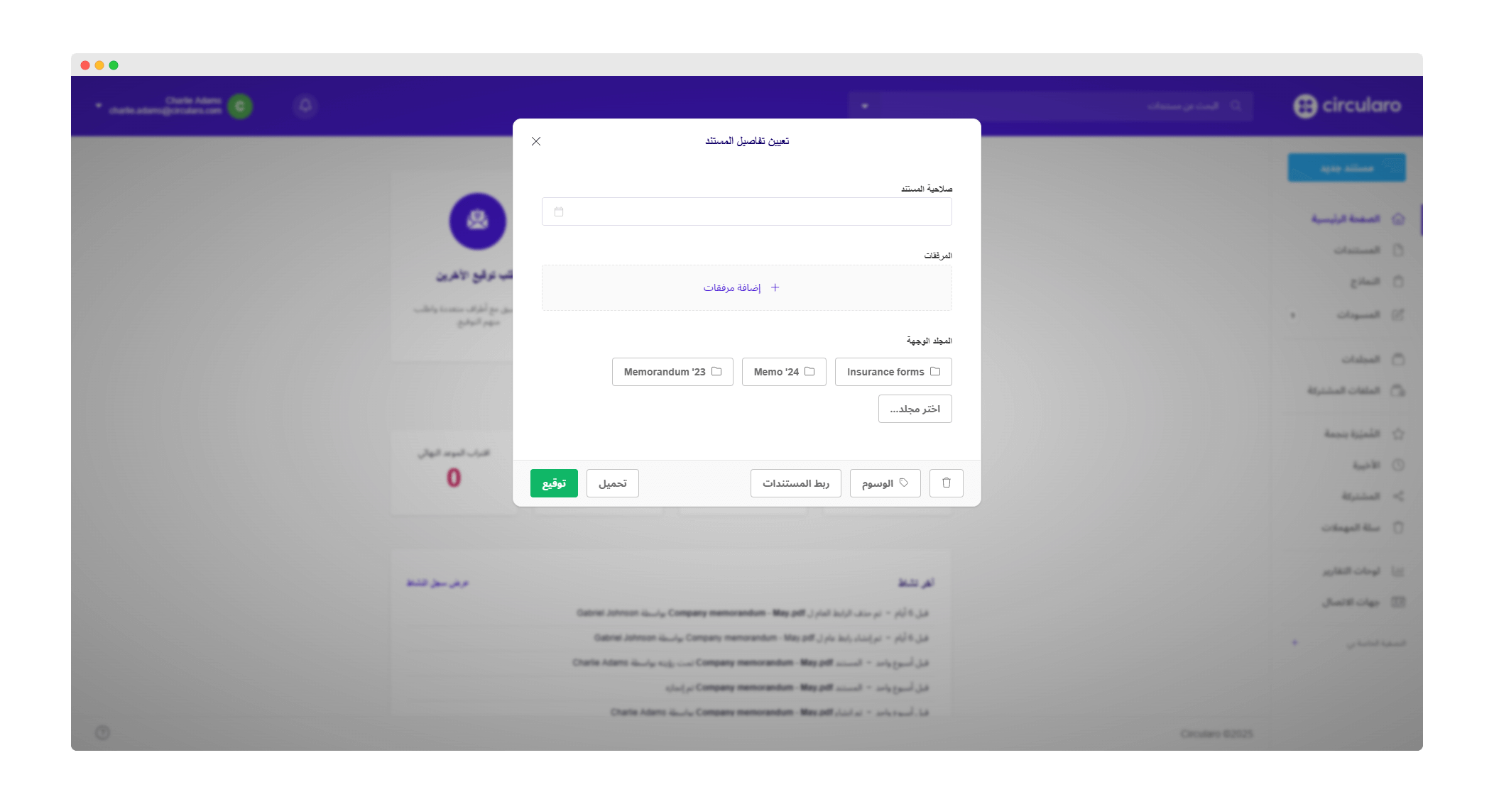 إذا كنت تريد أن تكون منظمًا حقًا، يمكنك رفع الملفات مباشرة إلى المجلدات. للقيام بذلك، انتقل إلى قسم "مجلداتي" أو "المجلدات المشتركة" في قائمة الإجراءات، واسحب المستند ببساطة من جهاز الكمبيوتر الخاص بك وأفلِته في المجلد الوجهة في Circularo.