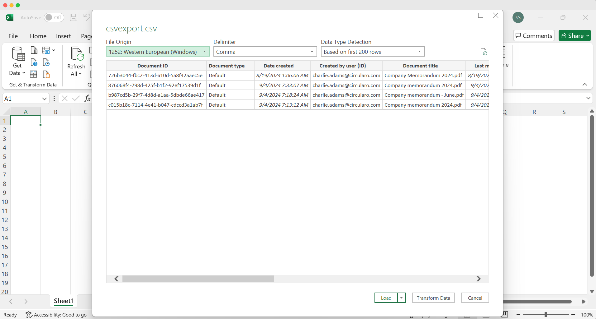بعد تحويل البيانات، يعرض Excel البيانات التعريفية من Circularo. هناك خيار تلقائي لتصفية المستندات أو فرزها.