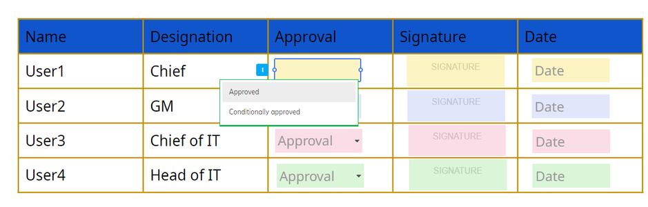 The recipient will simply select their approval choice from the dropdown and then add their signature in the corresponding row.
