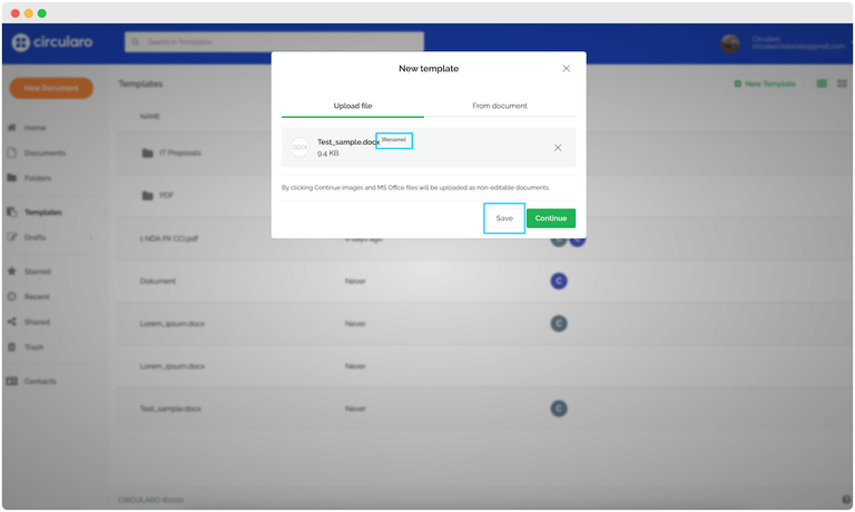 عند رفع مستند MS Word جديد أو اختيار مستند موجود في Circularo، يمكنك إعادة تسميته وحفظه كقالب.
