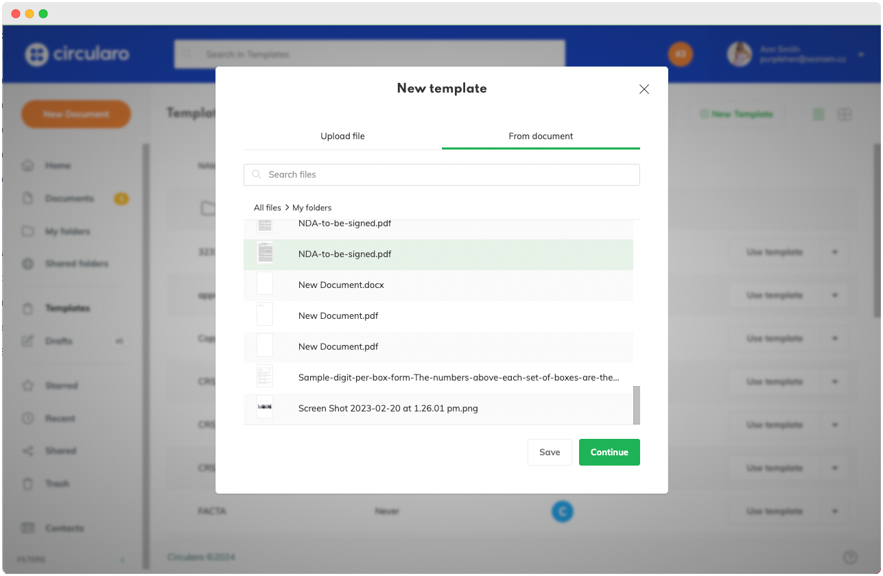 يمكن تحويل أي مستند موجود في Circularo إلى قالب دون الحاجة إلى رفعه مرة أخرى.