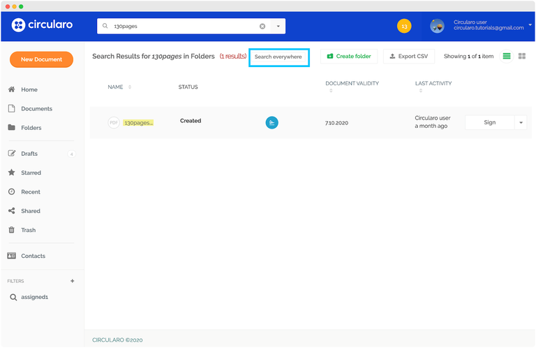 سيتم إجراء البحث الأساسي في سياق محلي بشكل افتراضي (في المجلد المفتوح، صندوق الوارد، المستندات المرسلة...). للبحث في جميع المستندات في النظام، انقر فوق زر بحث في كل مكان في أعلى الصفحة.