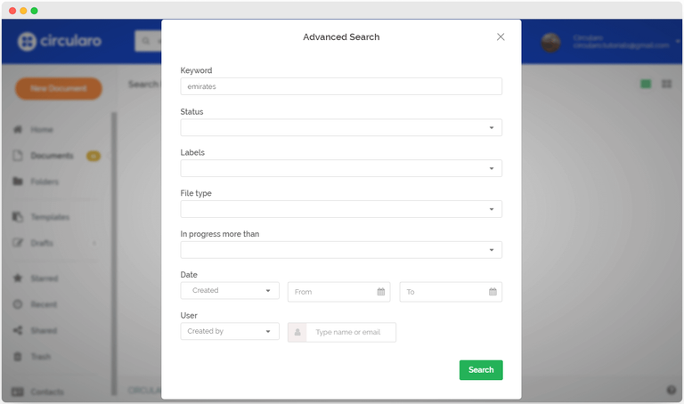 يتيح لك البحث المتقدم العثور على المستندات بناءً على قيم محددة. يمكن الوصول إليه من خلال النقر على السهم الموجود على الجانب الأيمن من شريط البحث.