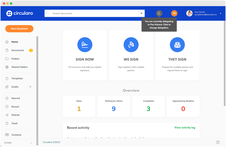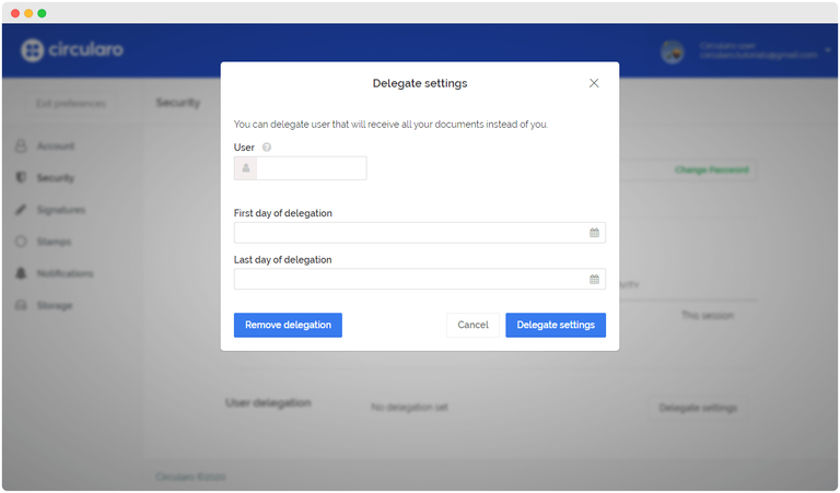 يمنحك Circularo خيار تفويض عملك لمستخدم آخر، والذي سيتلقى المستندات وينفذ الإجراءات نيابةً عنك لفترة زمنية معينة. هذه الميزة مفيدة عندما تكون في إجازة أو مريضًا أو مشغولًا للغاية.