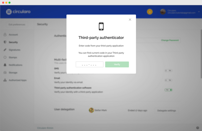 عند تمكين مصادقة البريد الإلكتروني، يتم إرسال رمز تحقق إلى عنوان بريدك الإلكتروني في كل مرة تُدخل فيها بيانات تسجيل الدخول الخاصة بك. ستتمكن من المتابعة إلى Circularo بعد إدخال الرمز في التطبيق.