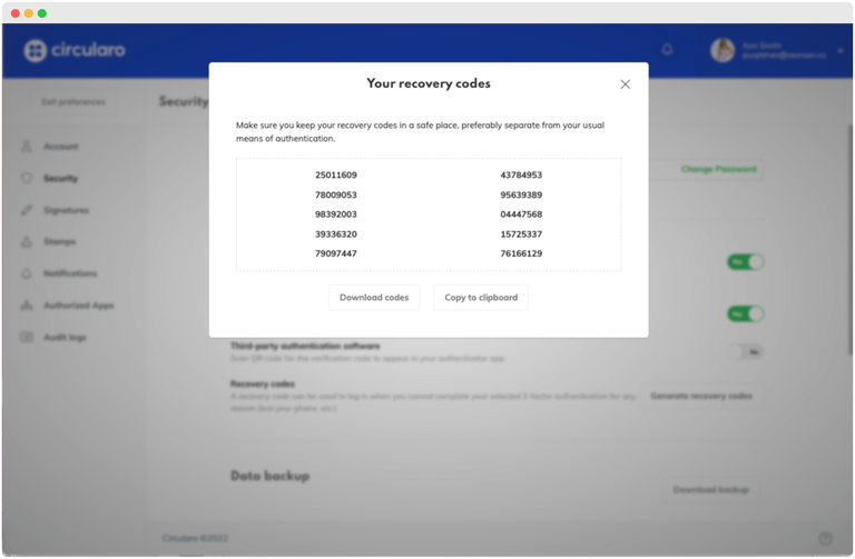 تأكد من تخزين رموز الاسترداد في مكان آمن، ويفضل أن يكون هذا المكان لا يتطلب نفس بيانات الدخول إلى حسابك في Circularo.
