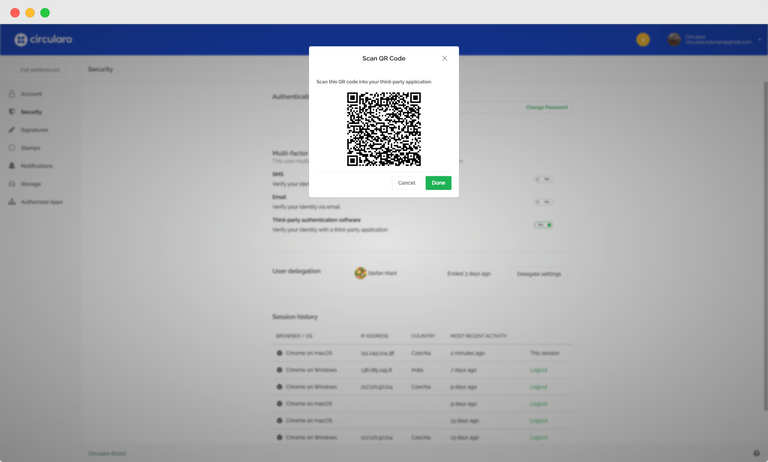 للاستفادة من هذه الميزة، تحتاج إلى تثبيت تطبيق مصادقة مدعوم على هاتفك الذكي. بعد تفعيل خيار المصادقة عبر تطبيق خارجي في Circularo، سيتم عرض رمز QR ليتم مسحه باستخدام تطبيق المصادقة.