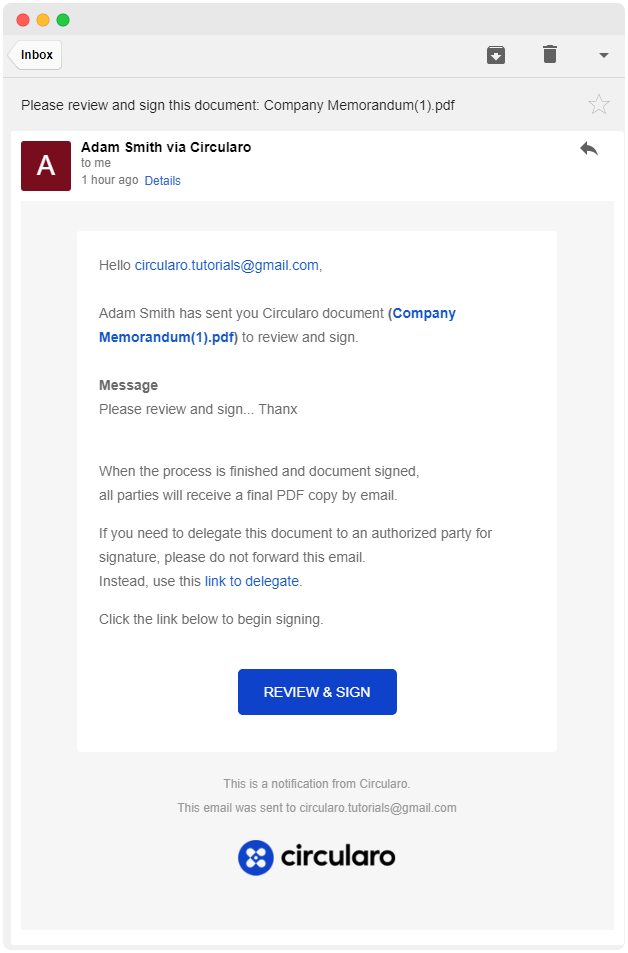 عند إرسال مستند إليك مع طلب التوقيع، سوف تتلقى إشعارًا بالبريد الإلكتروني من Circularo مرسلًا نيابة عن المرسل.