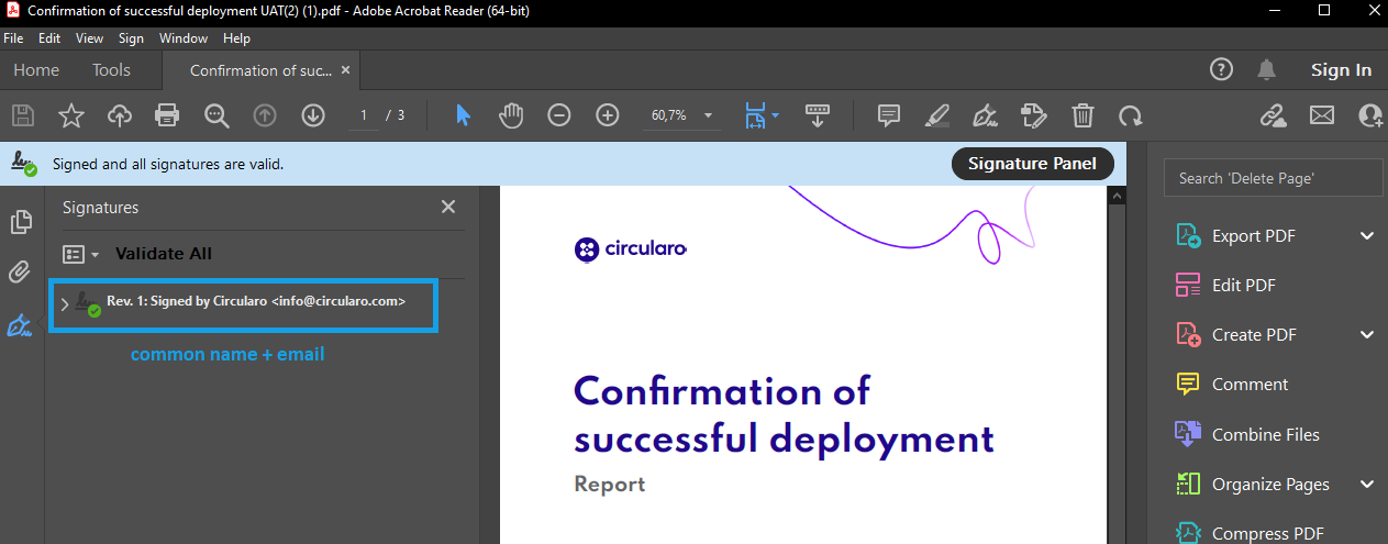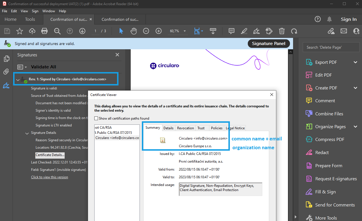 Use your own internationally recognised, Adobe Approved Trust List (AATL), and/or Telecommunications And Digital Government Regulatory Authority (TDRA) certified electronic certificate instead of the standard Circularo AATL electronic certificate. This add-on incorporates Employee Level Digital Identity into the certificate itself, becoming a part of the documents signed with the certificate.