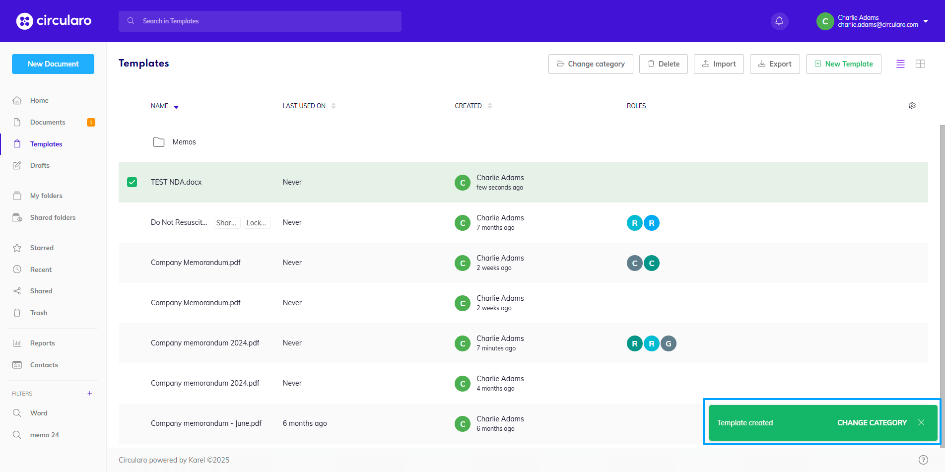 If you click on save, you will be notified that a new template has been created and you will be able to change its category if necesasary to keep yourself organized.