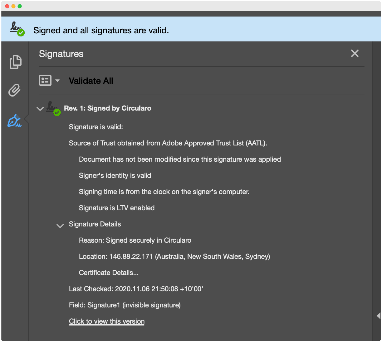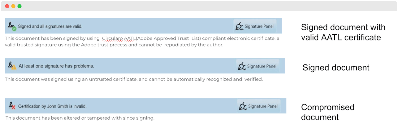 Verifying that your document has not been compromised and has been signed with an AATL-compliant certificate can be done easily via Adobe.