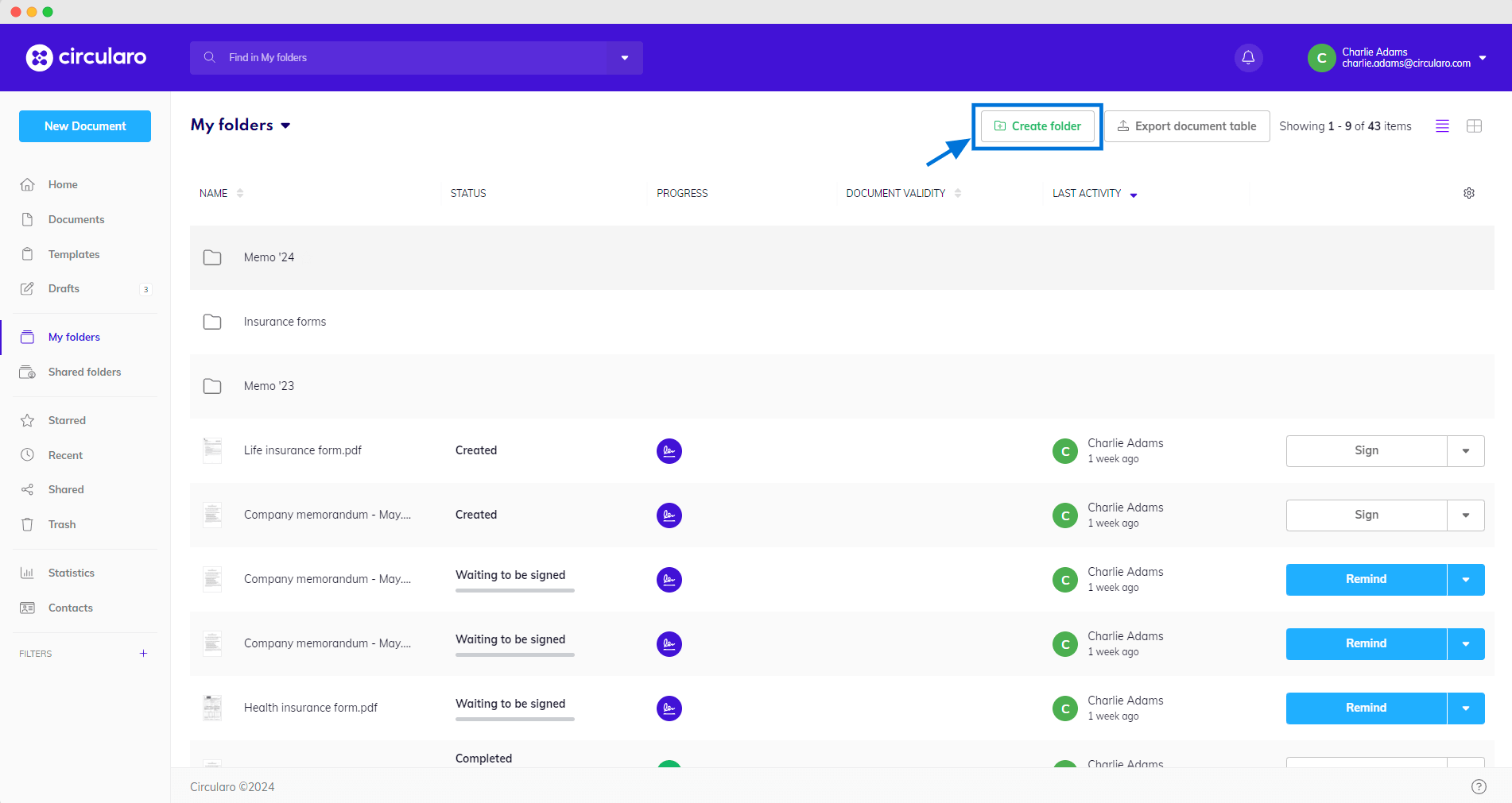 Create a structure of folders and subfolders to better organize your documents in the Folders section.
