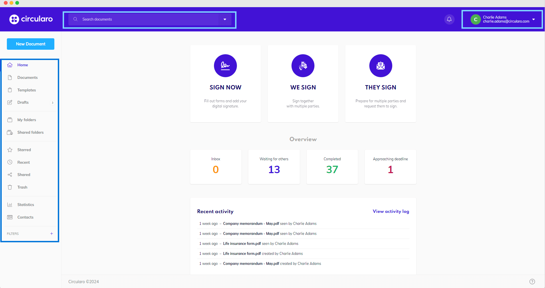 In the main section of your Home Page, you will find eSigning shortcuts to start signing documents immediately, a brief overview of your documents and their statuses, and your recent activity.