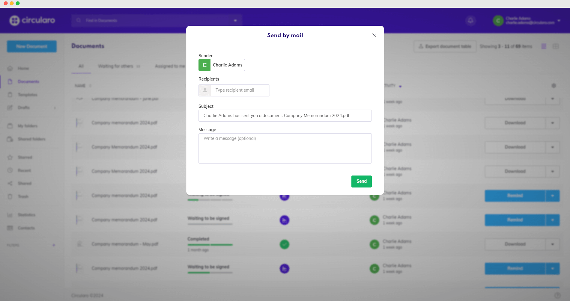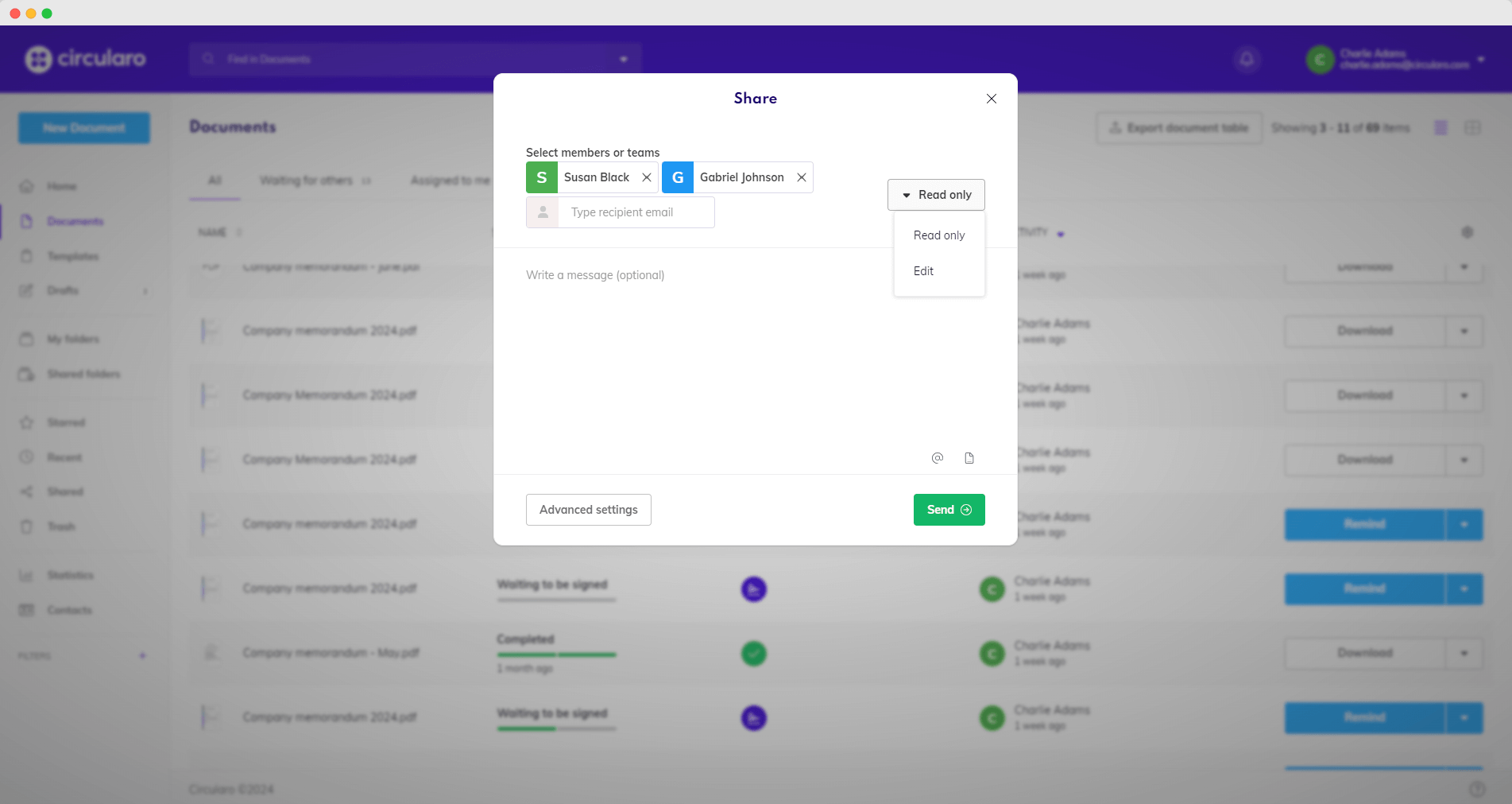 To share a document with another Circularo user or an external recipient, type in their email address. Then set the access rights (Edit or Read only) for every recipient.