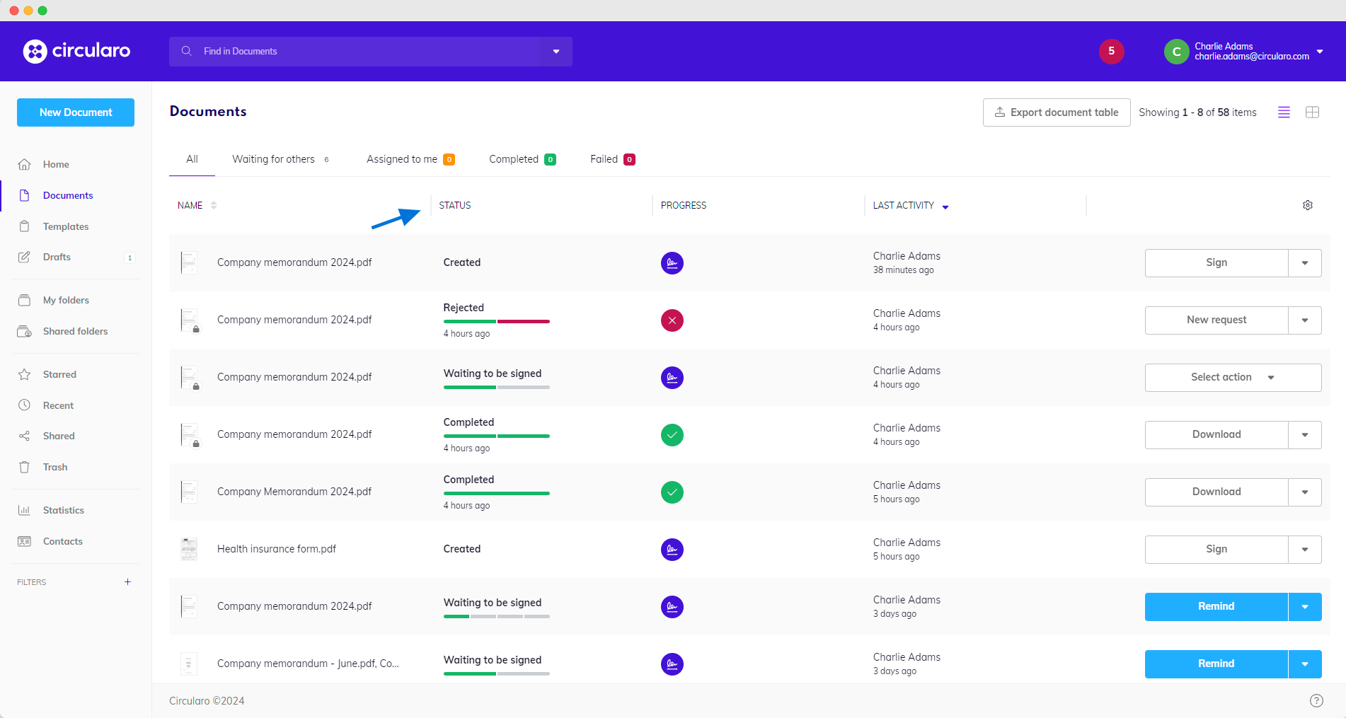 In the Documents section, you get a complete overview of your documents and their statuses.